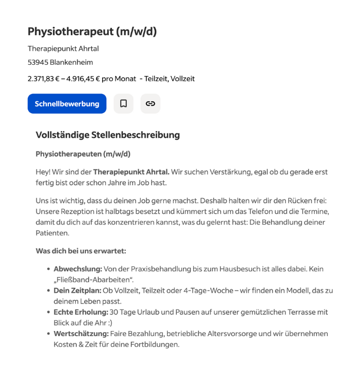 Das Ziel des Projekts war es, den Therapiepunkt Ahrtal bei der Personalsuche zu unterstützen. Konkret sollte eine visuell ansprechende Stellenausschreibung für Physiotherapeuten auf der Plattform Indeed erstellt werden, die sich qualitativ von Standardanzeigen abhebt.